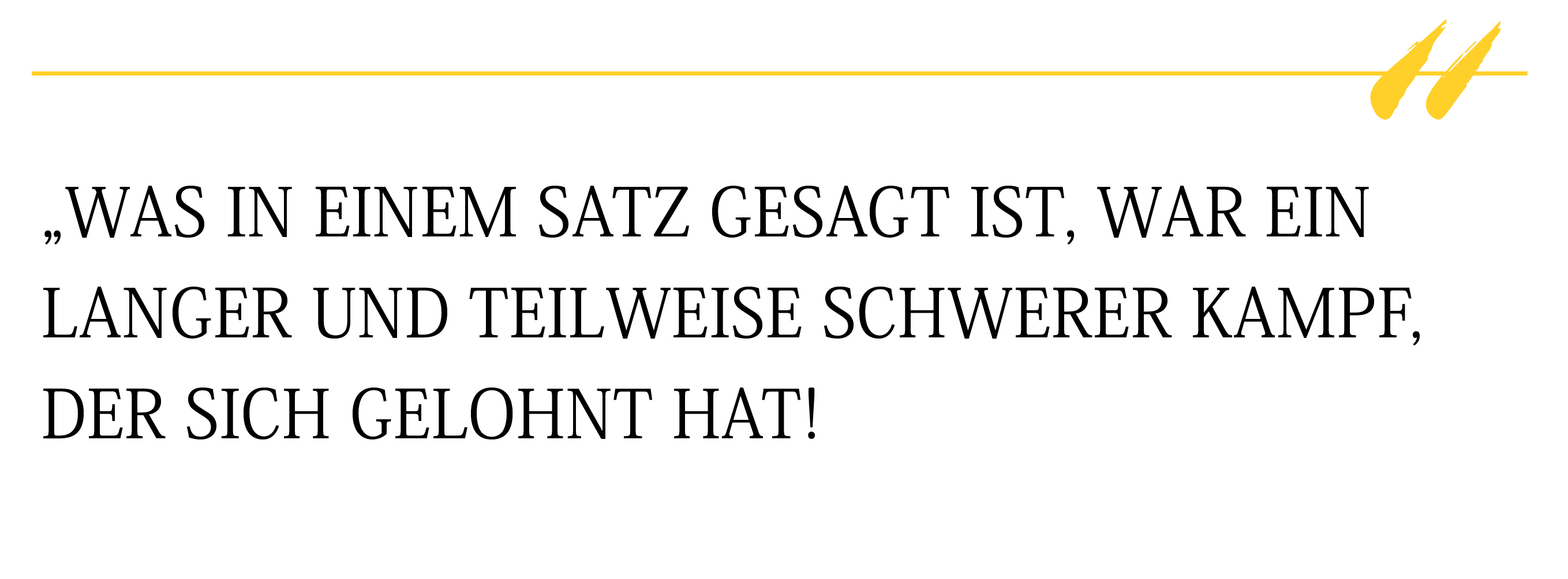 Ich nahm mein Leben selbst in die Hand, absolvierte eine Ausbildung am Berufsbildungswerk und startete danach volle Fahrt voraus endlich in mein wirklich eigenständiges Leben. Kein betreutes Wohnen, keine gesetzliche Betreuerin und auch keine Medikamente mehr! Was in einem Satz gesagt ist, war ein langer und teilweise schwerer Kampf, der sich gelohnt hat!